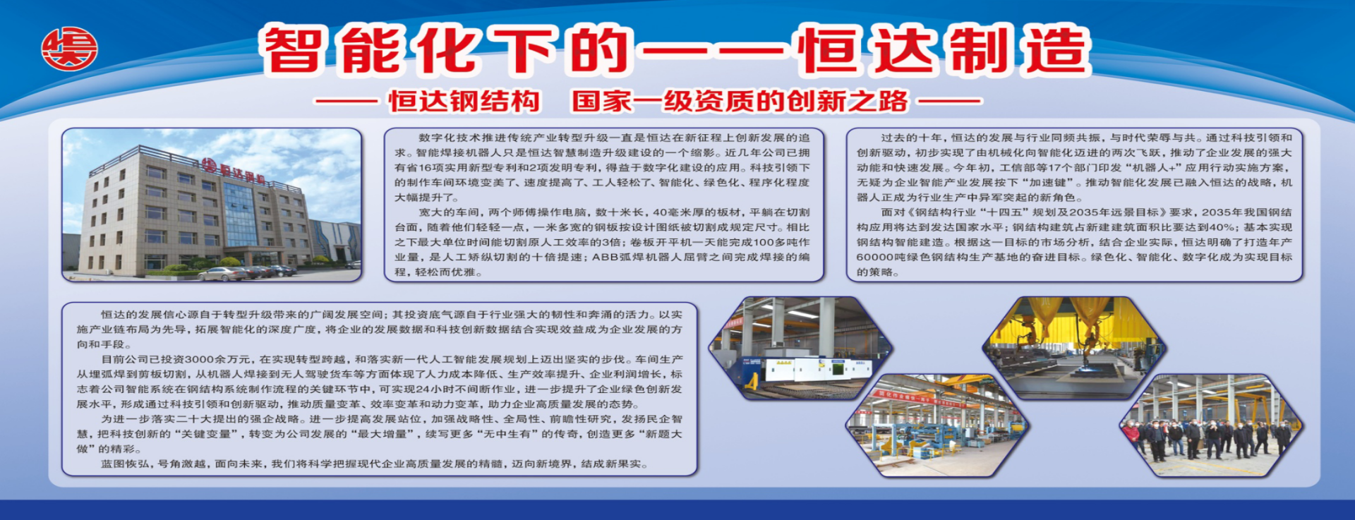 山西恒達(dá)鋼結(jié)構(gòu)工程有限公司始建于1998年,位于國家歷史文化名城、晉商故里——山西祁縣,緊鄰208國道,坐落于省級(jí)經(jīng)濟(jì)開發(fā)區(qū),毗鄰喬家大院景區(qū),地理環(huán)境優(yōu)越,交通十分便利。現(xiàn)有廠區(qū)占地面積200余畝,建筑面積60000平方米。 我公司是一家從事研發(fā)、銷售、制造和施工于一體的大型鋼結(jié)構(gòu)工程企業(yè),同時(shí)也是涂鍍鋼品及配套建筑圍護(hù)材料系統(tǒng)的專業(yè)生產(chǎn)廠商。多年來,逐漸確立了以商務(wù)寫字樓、賓館、高層住宅等為主的高層鋼結(jié)構(gòu)建筑體系,以大型煤倉、高鐵車站、體育場(chǎng)館等公共建筑為主的空間大跨度鋼結(jié)構(gòu)建筑體系,以工業(yè)廠房、低溫物流庫、多層鋼結(jié)構(gòu)建筑等為主的輕鋼結(jié)構(gòu)建筑體系。 我公司現(xiàn)擁有數(shù)條輕鋼結(jié)構(gòu)加工生產(chǎn)線、重型鋼結(jié)構(gòu)加工生產(chǎn)線、箱型梁柱加工生產(chǎn)線,同時(shí)配套有全自動(dòng)巖棉保溫復(fù)合板生產(chǎn)線、高鐵聲屏障、抑風(fēng)墻生產(chǎn)線,數(shù)控C型鋼生產(chǎn)線及各種規(guī)格的壓型板生產(chǎn)線三十余條,擁有年鋼結(jié)構(gòu)加工8萬噸、鋼結(jié)構(gòu)圍護(hù)面積120萬平方米的生產(chǎn)能力, [ 查看詳情 ]
