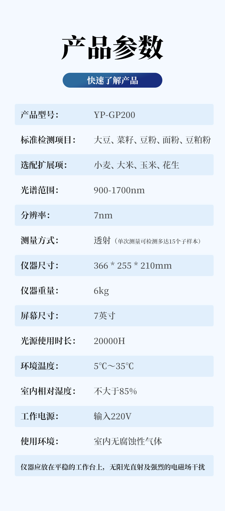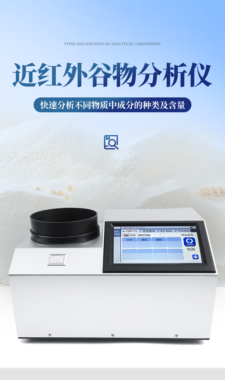 本儀器YP-GP200為近紅外光譜分析儀,可以根據近紅外光線照射樣品產生的光譜,快速分析不同物質中成分的種類(如蛋白、水分、油脂、纖維、灰分等)及含量,并可根據客戶需求添加模型。