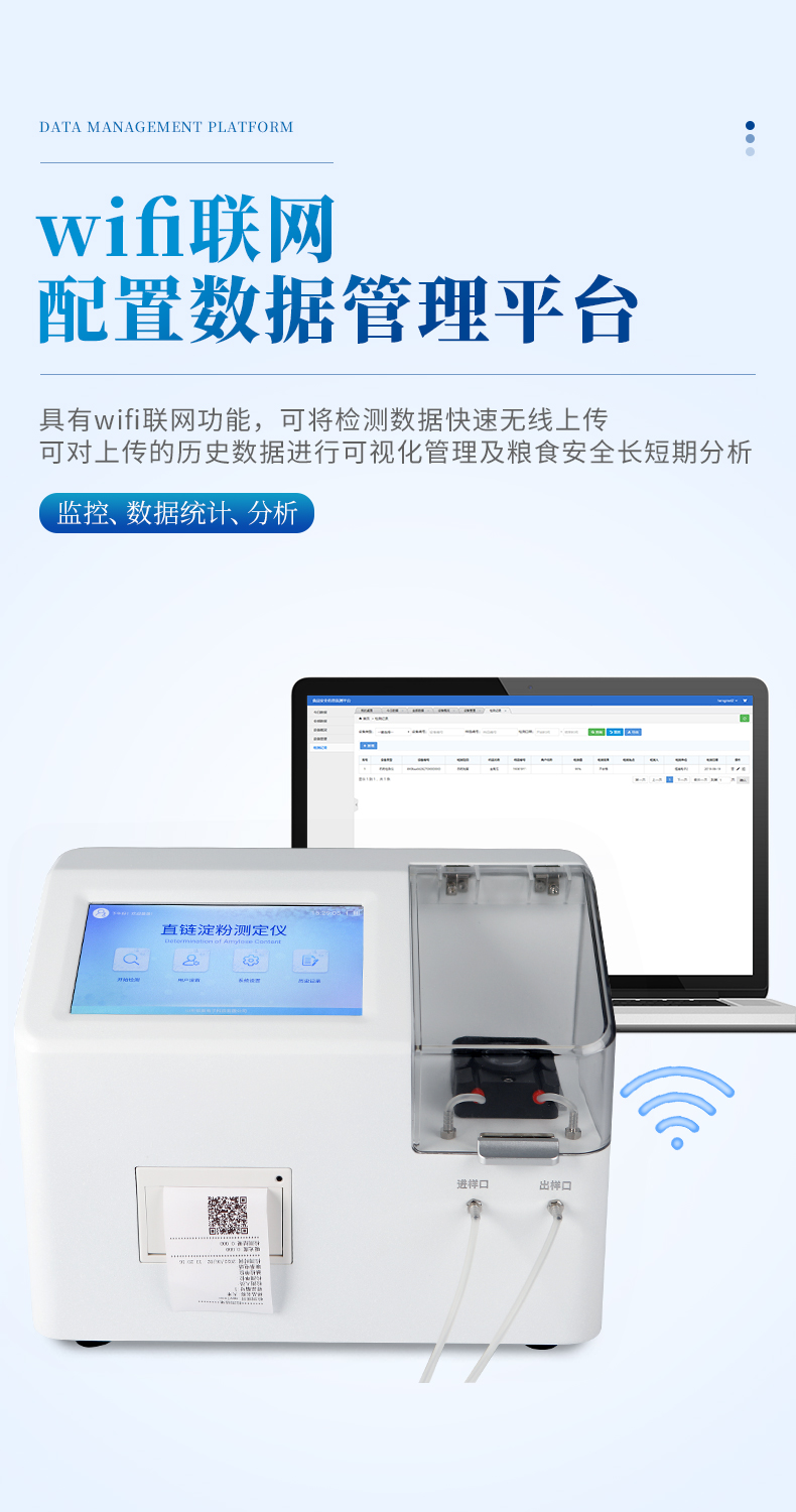 新一代智能直鏈淀粉測定儀集自動進樣技術和光電檢測技術于一體,是一種既可供實驗室使用,又可用于生產現場分析測試糧食直鏈支鏈、淀粉的快速分析設備。該儀器可用于大米,玉米,小麥、小米、馬鈴薯等糧食谷物的直鏈淀粉品質的快速檢測。該儀器內置標準工作曲線,是糧食部門和食品加工部門提高糧食直鏈、支鏈淀粉檢測水平與效率,控制糧食質量與成本的理想檢測儀器。
