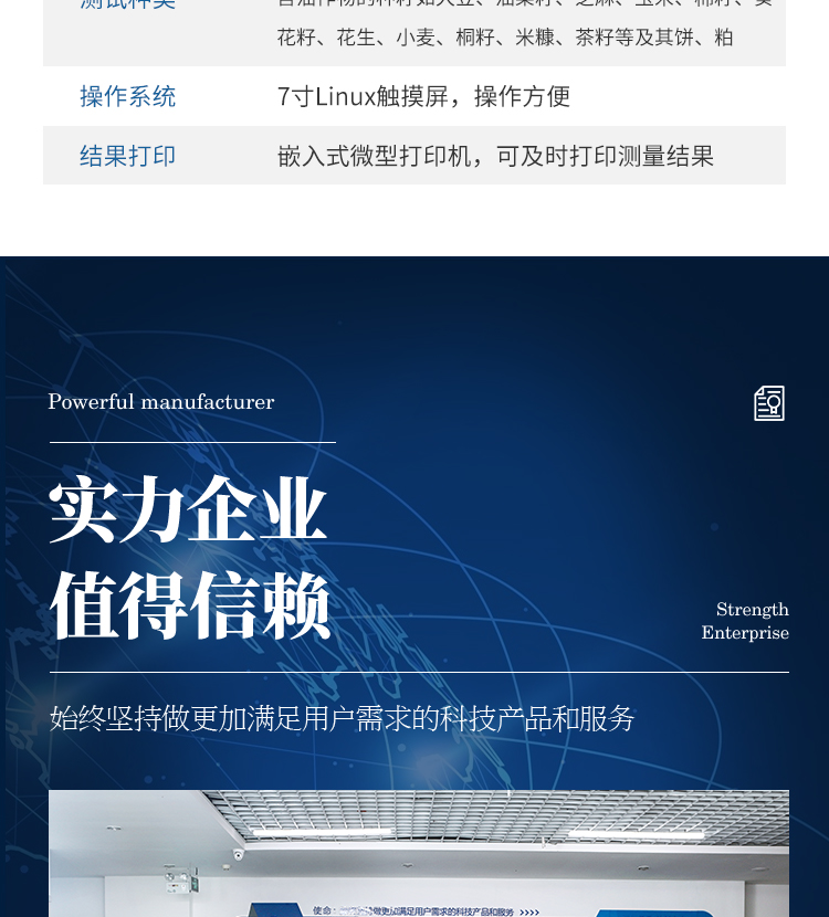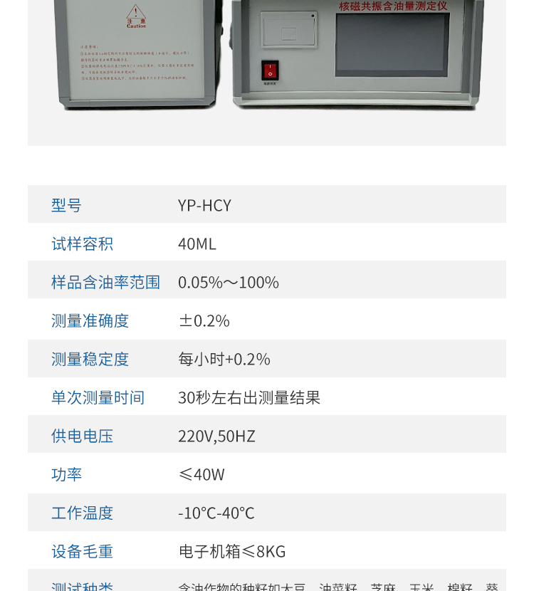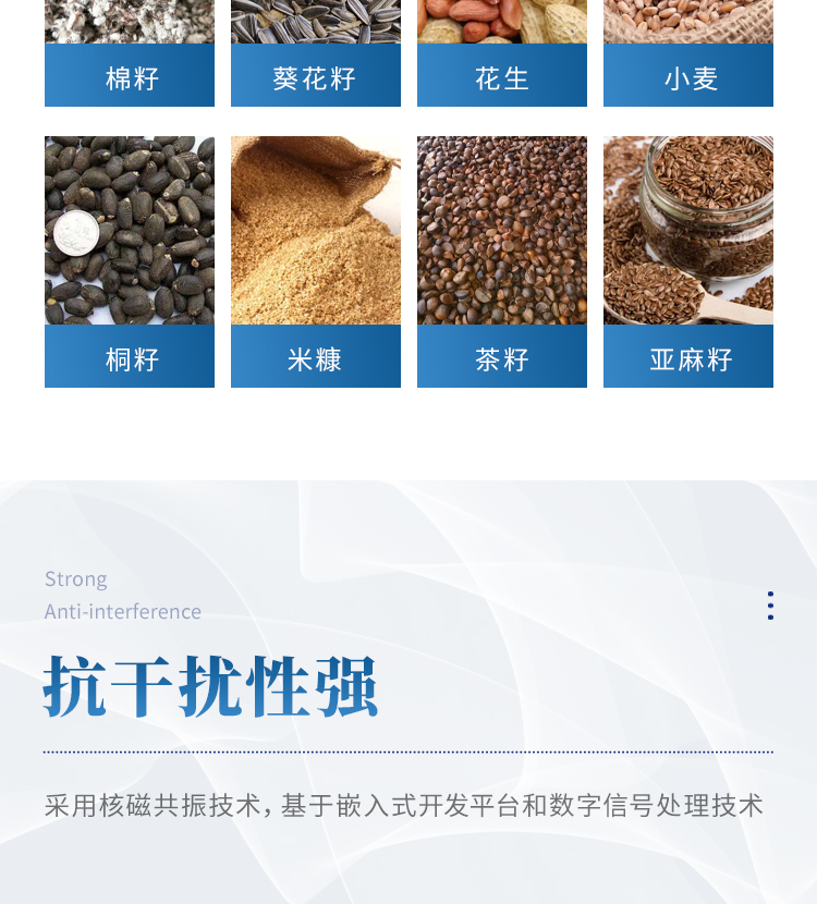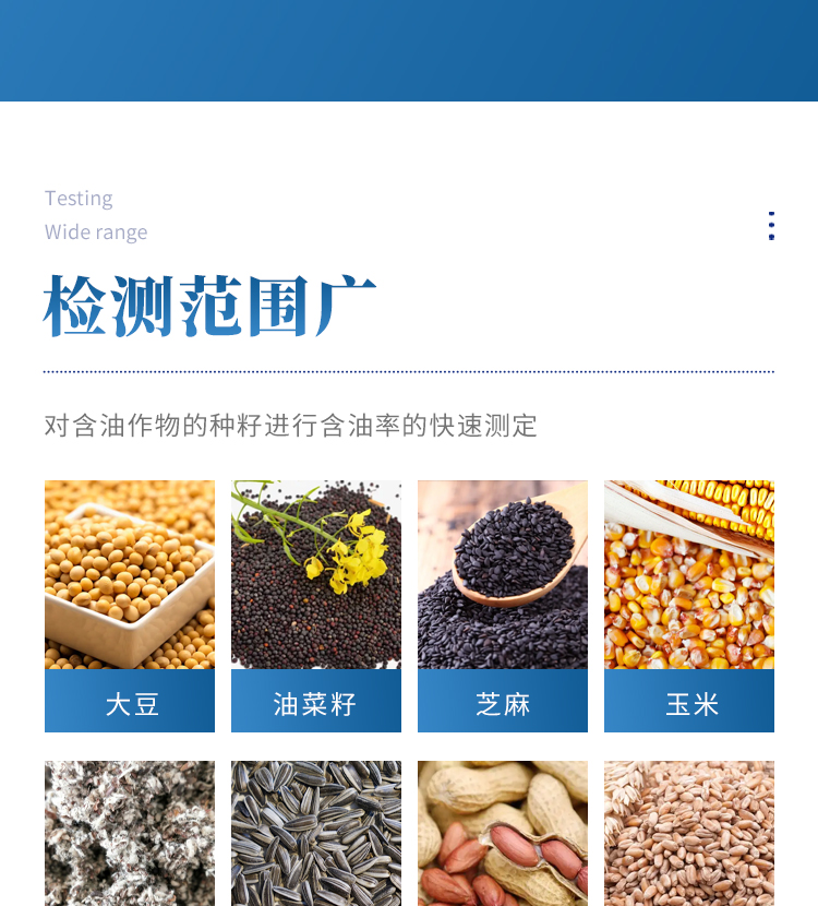 10、測試種類:含油作物的種籽如大豆、油菜籽、芝麻、玉米、棉籽、葵花籽、花生、小麥、桐籽、米糠、茶籽等及其餅、粕;